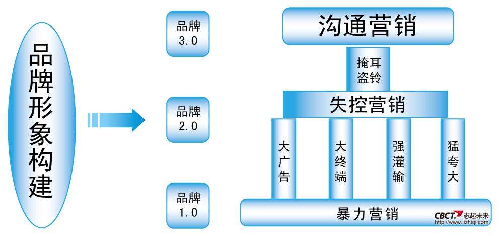 品牌1.0是暴力營銷的時代,以大廣告、大終端、強灌輸、猛夸大為特點,在改革開放初期廣告效果明顯。品牌2.0是失控營銷時代,使用暴力營銷的廠家越來越多,廣告花費越來越大,而消費者被暴力營銷練出了廣告免疫能力,營銷效果卻越來越差。