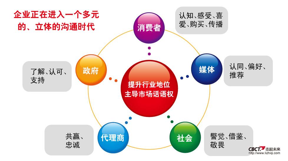 品牌3.0時代,企業(yè)正在進入一個多元的、立體的溝通時代,企業(yè)不僅要與消費者溝通,得到消費者的認知、感受、喜愛、購買和傳播;還要得到政府的了解、認可與支持;得到媒體的認同、偏好和推薦;與代理商雙贏;對社會輿論保持警覺和敬畏,注重公共關(guān)系建設(shè)。